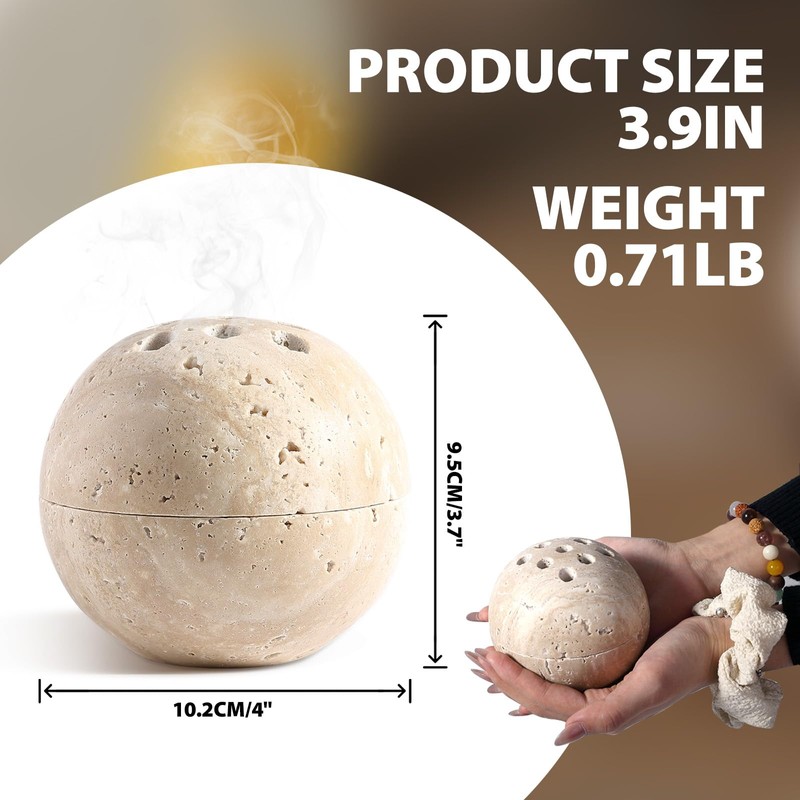 - Artisan-Handmade Travertine Resin Burner - Our skilled artisans carefully shape raw travertine stone into a smooth, spherical incense tray moon design (10cm diameter). Features a 9-hole lid for optimal fragrance with cones, sticks, or resins