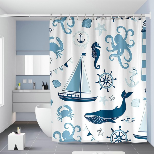 BCughia Shower Curtain 120 x 200 cm Anti-Mould Fish Boat Lighthouse Octopus Shower Curtains White Blue