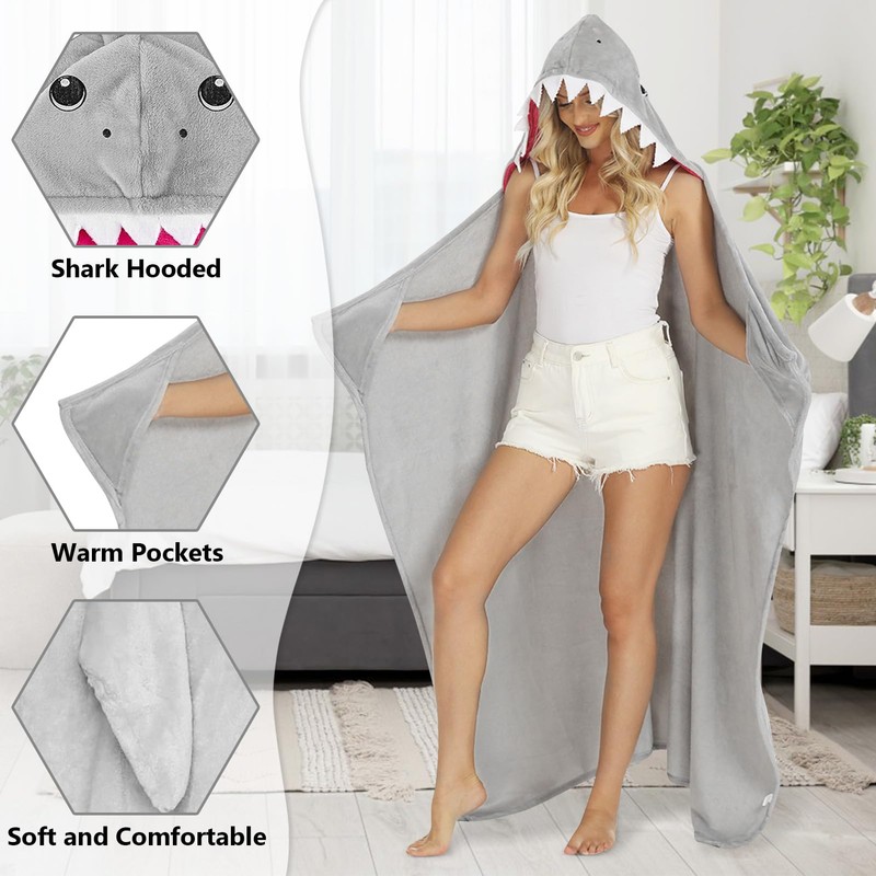 - Unique shark hood and paws, cute animal pattern cartoon design, make the hooded blanket look very cute! Sleeveless blanket keeps you warm anywhere and is the perfect gift for your best friends or girlfriend, so she feels appreciation and comfort with every use.