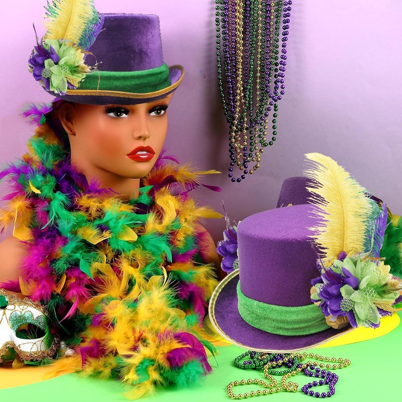 - Mardi Gras costume set: 1 piece Mardi Gras scarf, 1 piece feather headband, 1 piece face cover, 1 piece purple glove, Personality Mardi Gras scarf: The Mardi Gras scarf is designed with traditional colors, stripe patterns and fringes on the hem, and will be a hit at the party.