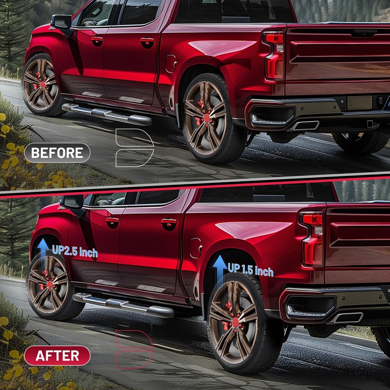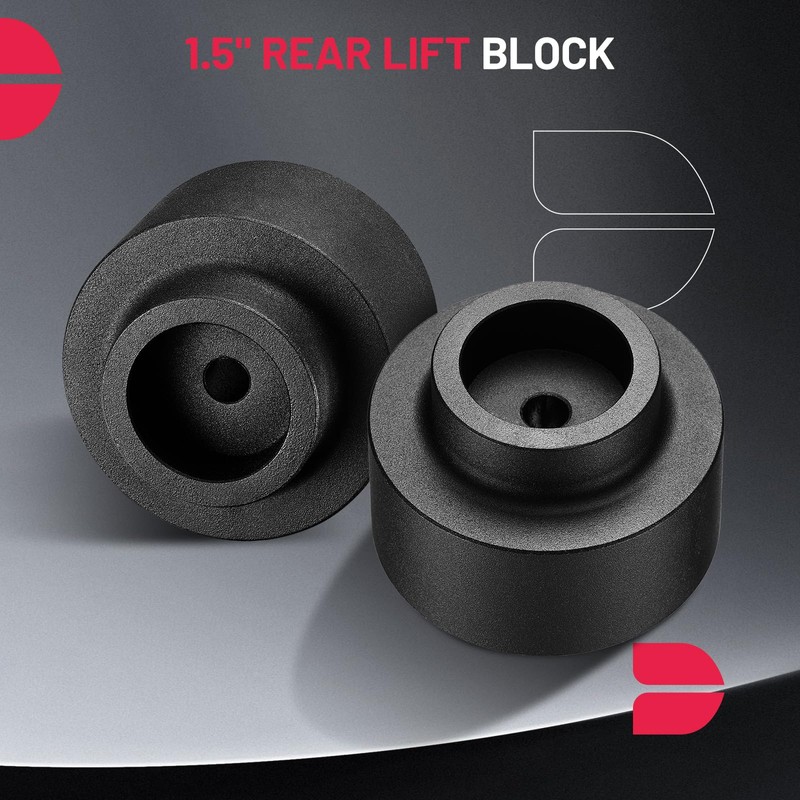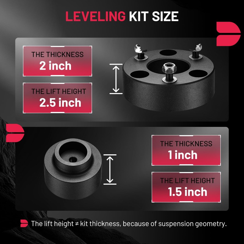 - 【Function】Improves the look of your vehicle and provides additional fender clearance for larger tires and wheels. With your truck's newly added height, your undercarriage will be a lot safer from damaging road obstacles. Note: The thickness of the leveling Lift Kit will raise your truck by 1.5 inches at the rear and 2.5 inches at the front. The ratio of the front lifting height to the thickness of the lift kit is not 1:1, this is due to suspension geometry.