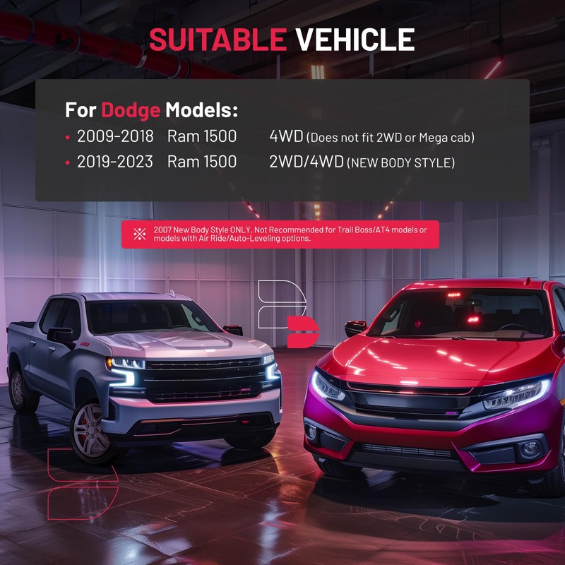 - 【Compatibility】BDFHYK 2.5" front and 1.5" rear leveling lift kit compatible with Dodge Ram 1500 2009-2010, 2011-2023 Ram 1500. (2009-2018 Ram 1500 4WD, Does not fit or Mega cab. 2019-2023 Ram 1500 4WD, NEW BODY STYLE) Not for use on air-suspension equipped trucks. This set will raise the front of the truck by 2.5" and the rear of the truck by 1.5". Please make sure the size and compatible models when you purchase.