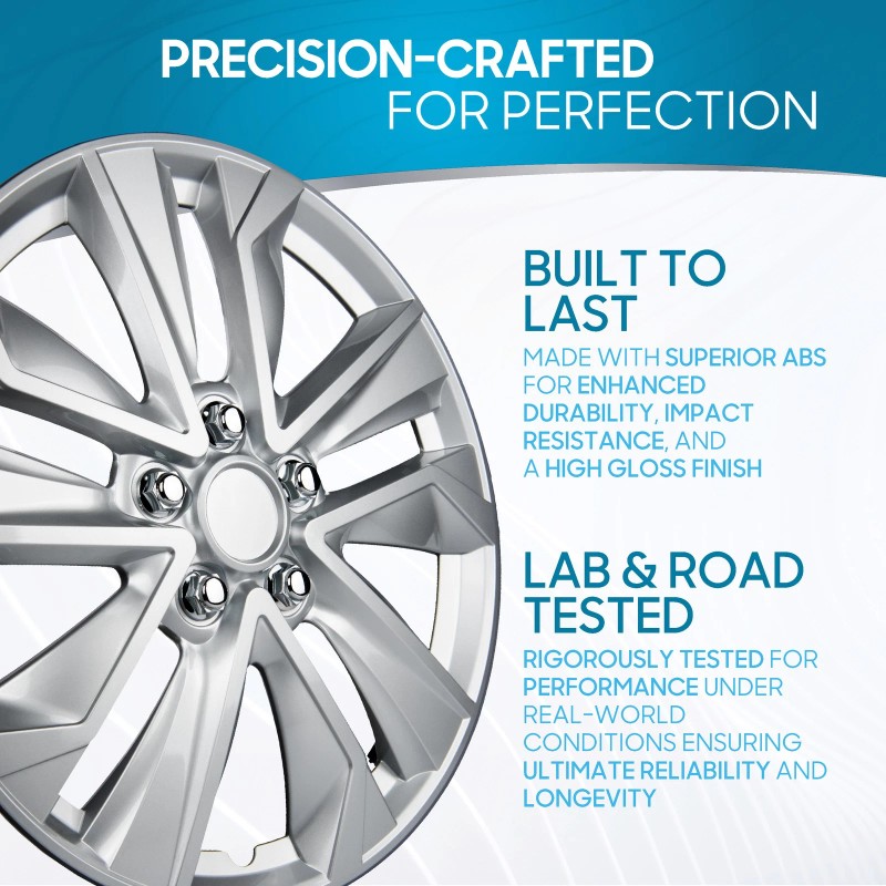 - STYLISH 10-SPOKE DESIGN – OEM LOOK UPGRADE: Featuring a sleek silver 10-spoke design, these hubcaps give your vehicle a polished, OEM-style upgrade. The modern finish complements any color car or truck while covering unsightly steel wheels. Perfect for drivers looking to boost curb appeal without replacing entire rims, these 16 inch wheel covers combine form and function for a clean, professional appearance.