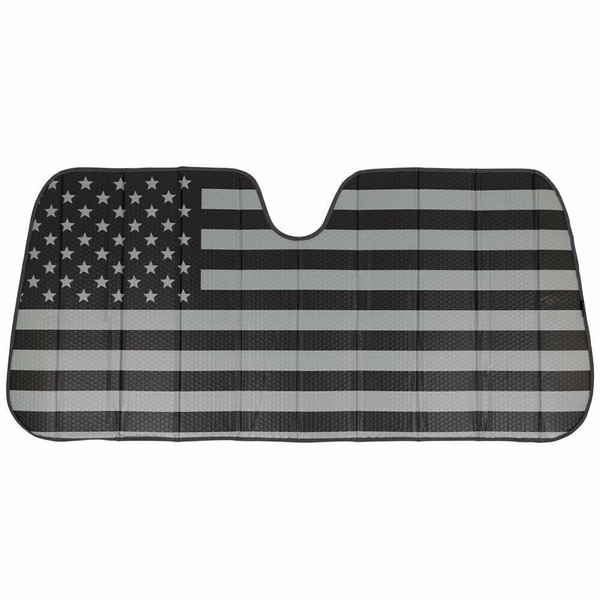 Show your American Pride with our Black Flag sun shade. It will block UV and Heat protecting your car's interior from fading and/or cracking. While doing this it will also keep your seats and steering wheel cool from the heat. Equipped with a top inset contour makes fitting the shade to your rearview mirror. The soft and durable tapered edges will allow the shade to fit snugly to your windshield. Lastly, our shade folds accordion style perfect for a quick and compact storage.
