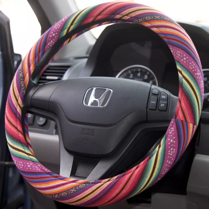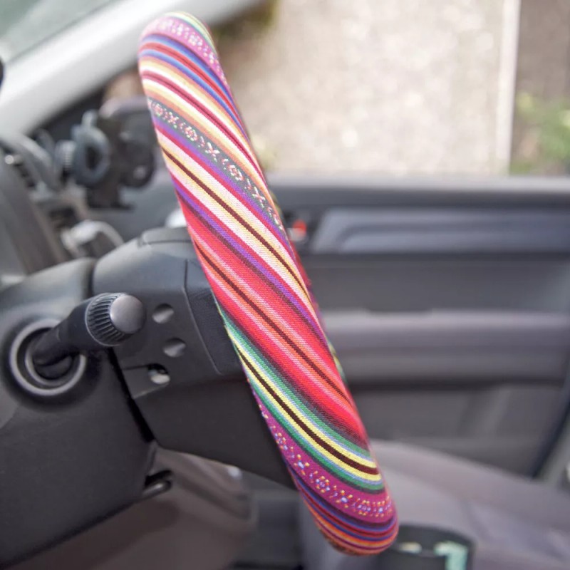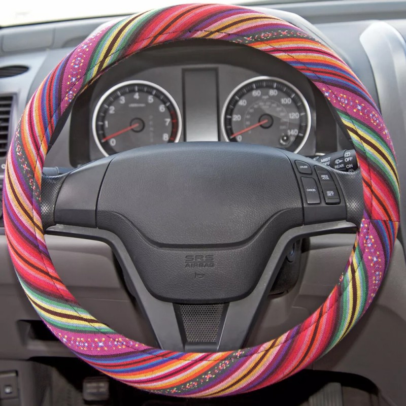 These colorful patterned steering wheel covers are made of saddle blanket to be extremely durable and sweat absorbing. The fabric is thick, comfortable, and its non-slip material provides better handling while driving.