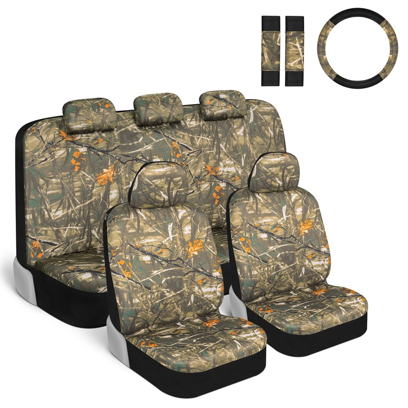 BDK Hunter Camo Car Seat Covers Full Set with Steering Wheel Cover and Seat Belt Pads – Real Mossy Tree Oak Forest Camouflage Pattern, Automotive Front & Bench Back Seat Cover for Cars Trucks SUV
