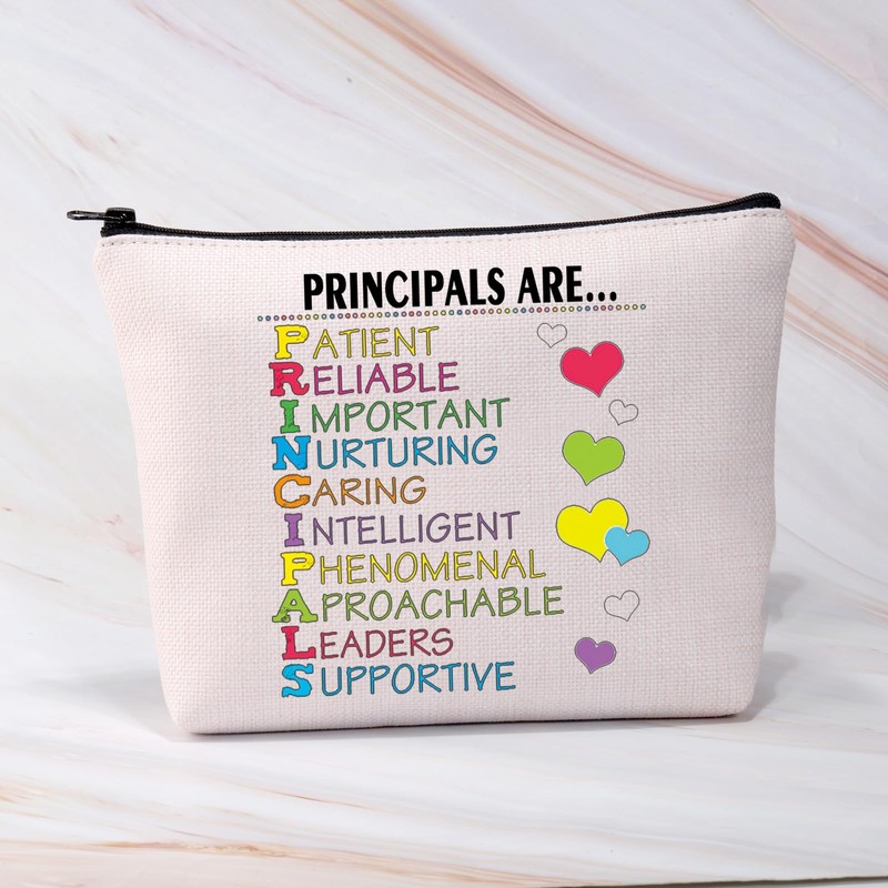 - Bag with Principal Quote: PRINCIPALS ARE... PATIENT RELIABLE IMPORTANT NURTURING CARING INTELLIGENT PHENOMENAL APPROACHABLE LEADERS SUPPORTIVE. This Principal makeup bag is a perfect gift for Principal Thank You, Principal Retirement.