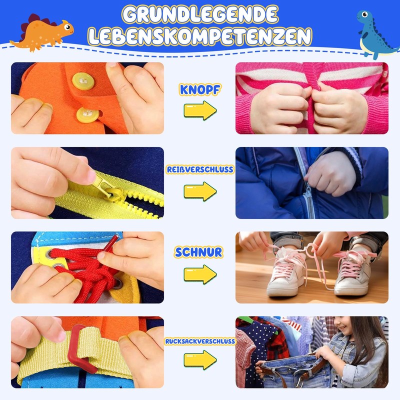 - Thoughtful design for little hands - This motor skills toy helps children learn basic everyday skills: buttons and laces help practice dressing, knobs and zips promote fine motor skills and hand-eye coordination. Perfect as a busy board from 3 years to grab and discover.