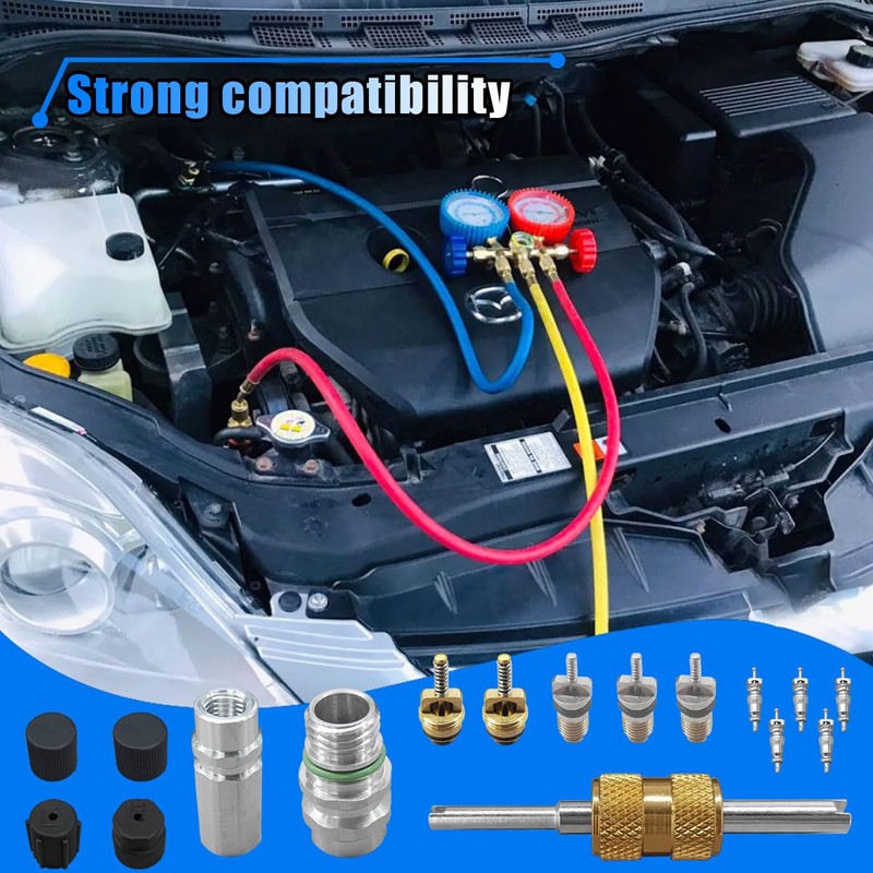 - 【Portable Design】:This car air conditioner valve core kit is fully equipped, easy to carry and store, and can be placed in the trunk of the car so that you can repair the faulty air conditioning system at any time without going to the car repair shop.