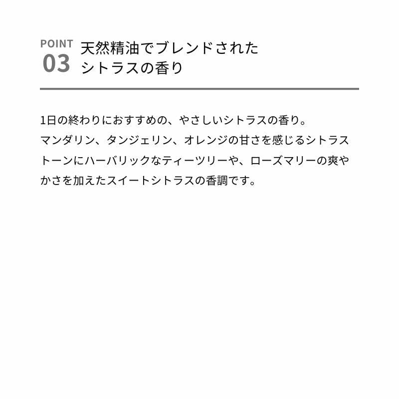 - POINT 03 Citrus scent blended with natural essential oils A gentle citrus scent recommended at the end of the day. A sweet citrus scent with a sweet citrus scent of mandarin, tangerine, and orange with a herbic tea tree or rosemary freshness