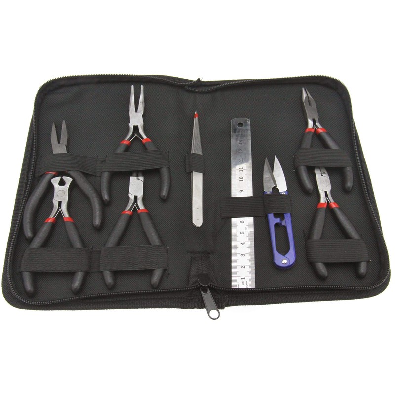 - The set includes: 1 x Round nose pliers, 1 x Long nose pliers, 1 x Bent nose pliers, 1 x Diagonal side cutters, 1 x End cutting pliers, 1 x Flat nose pliers, 1 x Scissors, 1 x Ruler, 1 x Tweezers, 1 x PU Case