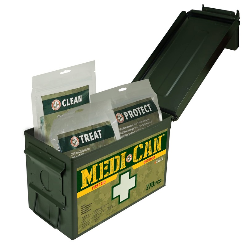 The Be Smart Get Prepared Medical first aid-advanced wound care kit has 270-pieces to stop bleeding fast and save lives. The airtight, heavy duty utility ammo can (7.00in x 11.00in x 3.75in) is organized and easy to use. The pre-packed treatments make it easy to clean, treat and protect you in the elements against cuts and abrasions, minor wounds and lacerations. – clean – (15) antiseptic wipes> (15) Alcohol prep pads – treat – (1) first aid guide (1) tweezers (2) Instant cold packs 5 in x 6 in (4) Nitrile gloves 2 pair (4) finger splints> (5) antibiotic Ointment> (5) burn creams (6) sting relief pads (10) aspirin tablets 5 packs (10) Non-Aspirin tablets 5 packs (20) cotton tip applicators 2 packs – protect – (1) adhesive tape 1/2 in x 2-1/2 yds (1) triangular bandage 40 in x 40 in x 56 in (2) Gauze Pads 5 in x 9 in (3) safety pins (4) Gauze Pads 4 in x 4 in (6) Gauze Pads 2 in x 2 in (10) Butterfly closure> (20) adhesive Bandages 1 in x 3 in (50) adhesive Bandages 3/8 in x 1-1/2 in (75) adhesive Bandages 3/4 in x 3 in