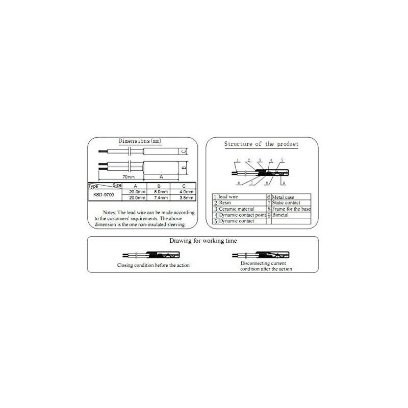 - ●(Normally Closed) It is close until the surface reaches Action Celsius degree and then the switch open, automatically reset.