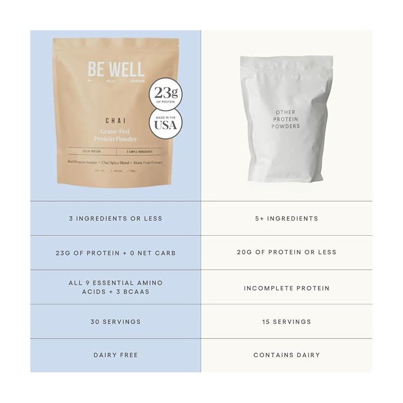 Be Well by Kelly LeVeque Be Well by Kelly Chai Grass-Fed Beef Protein Powder, 23G of Protein & 1G of Carbs (3 Ingredients, 30 Servings) 9 Amino Acids + 3 BCAAs No Soy, No Dairy, Stevia-Free, No Sugar Added 1.65lb 750g
