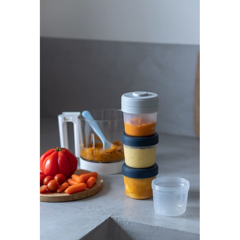 Beaba Set of 4 Storage Pots, Interlocking, Stackable and Linkable pots, 100% Airtight, Measuring Gauge, Freezable, Breastmilk Storage, 4x150ml, Grey/Blue