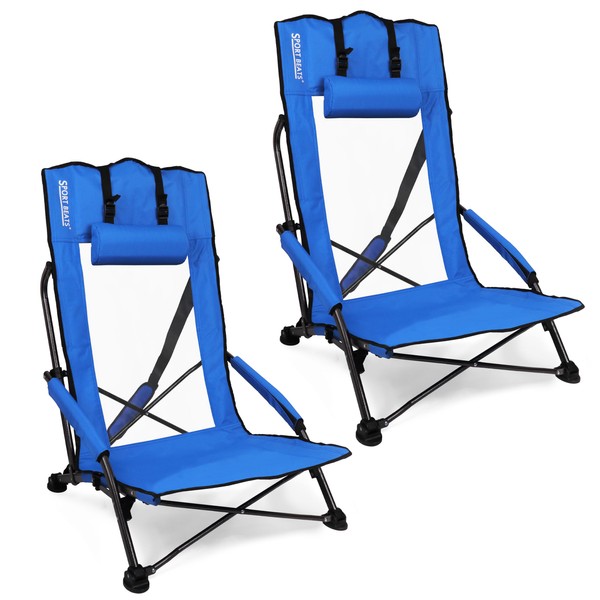 High Back Low Profile Beach Chairs 2 Pack - Extra Wide 22.5" Folding Backpack Sand Chair with Headrest, Ergonomic Seat & Breathable Mesh - Heavy Duty Portable Seat for Outdoor, Concerts, Camping