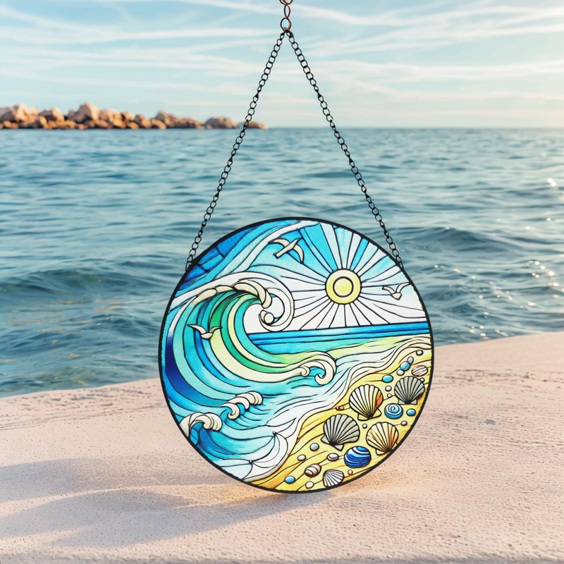 Beach Decor Suncatcher Stained Glass Sun Catcher for Windows, Sea Decor - 7.8 Inch Window Hanging Suncatcher, Summer Beach Gift, Nautical Decoration for Indoor Living Room Housewarming Birthday Gifts