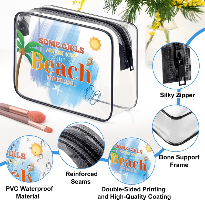 - Beach Themed Makeup Bag:Double-sided printed, high quality coating, Lightweight cosmetic bag size - 7.5*2.4*5.5 inches/ 19*6*14cm. Made of quality PVC material, this zippered clear toiletry pouch is durable in quality, not easy to tear or break, able to support long-term use,nice for organizing and storing your daily necessities. It is convenient to take with you when traveling or going out.