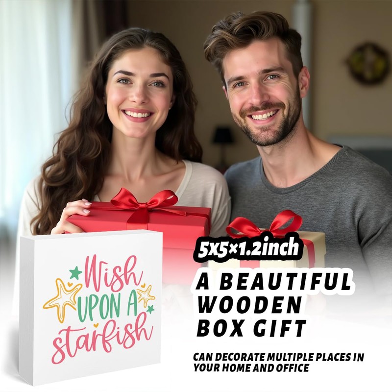 Beach Starfish Decor, Summer Room Decor Rustic Farmhouse Wooden Box Sign Plaque for Home Office Bathroom Bedroom Living Room Cubicle Desk Tabletop Shelf Decoration