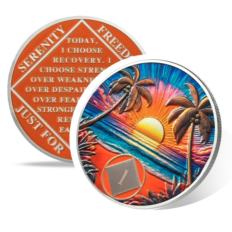 - Symbol of commitment and strength: this 1 year sobriety coin celebrates your way to sobriety with a gorgeous design that features a peaceful beach scene with palm trees. This coin symbolises strength, resilience and peace. Ideal for anyone on their addiction recovery path, this sobriety coin serves as a daily reminder of how far you have come and your unwavering commitment to a sober life