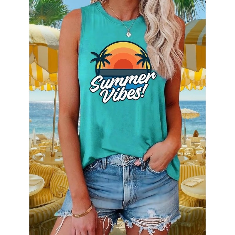 Beach Vacation Clothes for Women Novelty Summer Vibes Graphic Print Hawaiian Clothing Summer Sleeveless Lake Mode Tanks(Mint Green XL)