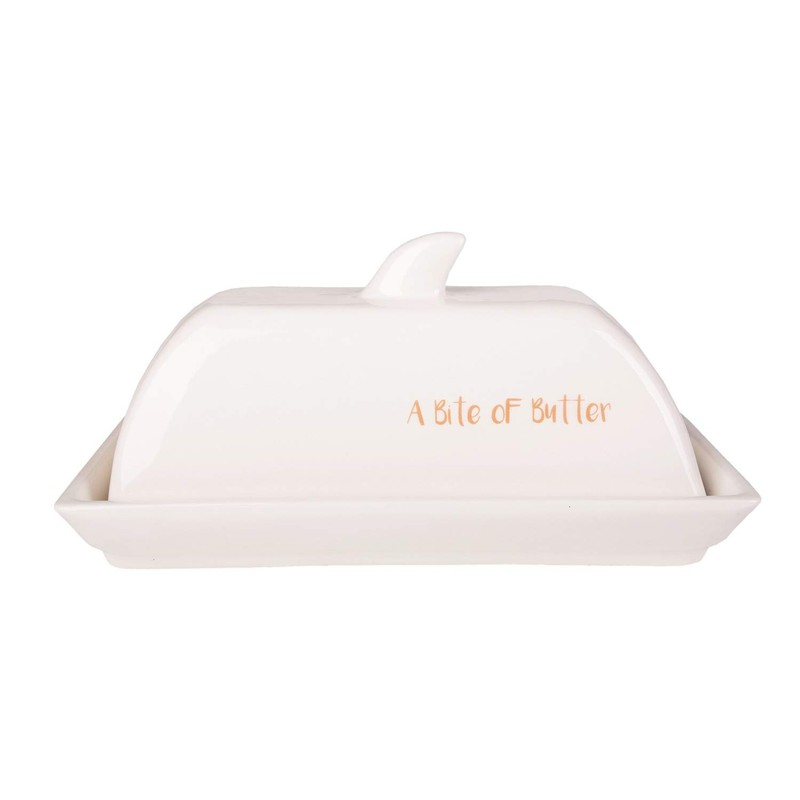 - Bite of Butter Shark Shape Butter Dish features a dish with lid shaped like a shark with a fin as the handle and sentiment reading "A Bite of Butter"