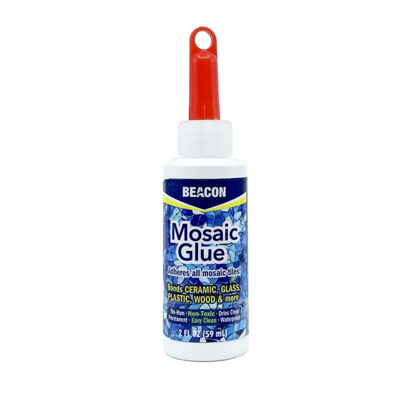The perfect glue for creating indoor and outdoor mosaic projects. This no- string formula is also non-toxic and never runny, making it easy to apply ceramic tiles, glass, plastic and wood to all kinds of surfaces. Beacon's Mosaic Glue dries clear and is water and weather resistant. It's great for a variety of craft, hobby, and household applications. This package contains one 2 ounce bottle of Mosaic Glue. Conforms to ASTM D4236. Made in USA.