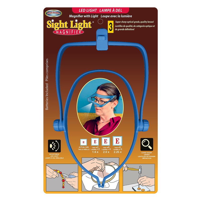 - The Bead Buddy Sight Light Magnifier is Like Having an Extra Set of Helping Hands. The Headband Magnifier has 3 Different Levels of Magnification and Acts as a Jewelers Loupe. Magnifying Visor with Swivel LED Light is the Perfect Accessory for Needlepoint, Beading, Sewing, and Quilting.