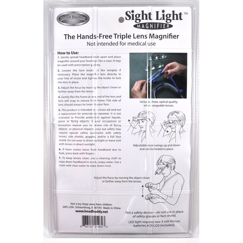 - The Bead Buddy Sight Light Magnifier is Like Having an Extra Set of Helping Hands. The Headband Magnifier has 3 Different Levels of Magnification and Acts as a Jewelers Loupe. Magnifying Visor with Swivel LED Light is the Perfect Accessory for Needlepoint, Beading, Sewing, and Quilting.