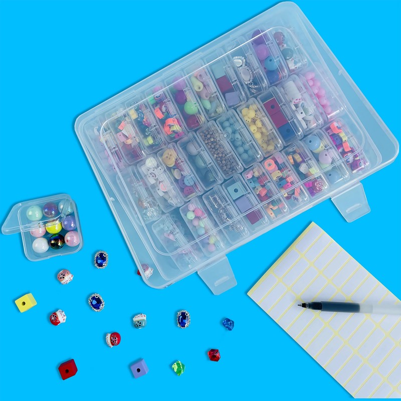 - 【PACKAGE INCLUDE】 3 Large transparent plastic organizer boxes with hinged lids, 90 mini transparent storage containers and 3 sheets label stickers used for mark. This is perfect to organize small items. Whether in jewelry making, hand-beading, storage splicing toys, office supplies, they all have a very good performance