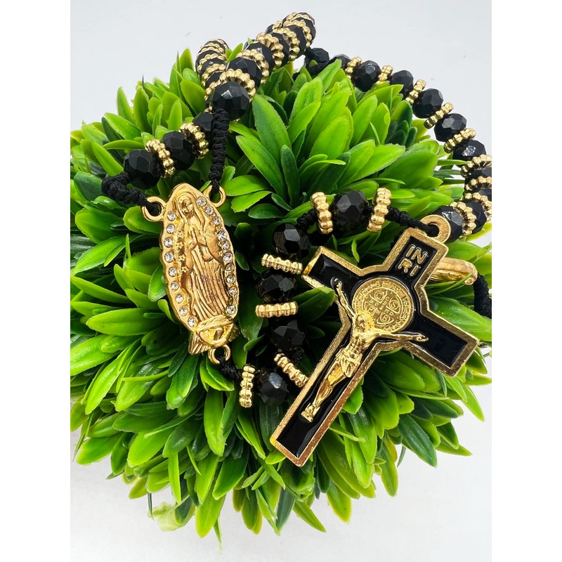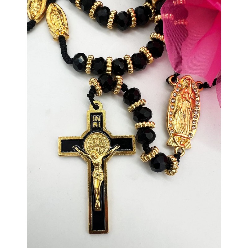 Bead Rosary Necklace with Crucifix and Our Lady of Guadalupe Medal Black Beads Catholic Prayer Rosaries Necklaces Jewelry Gifts Box