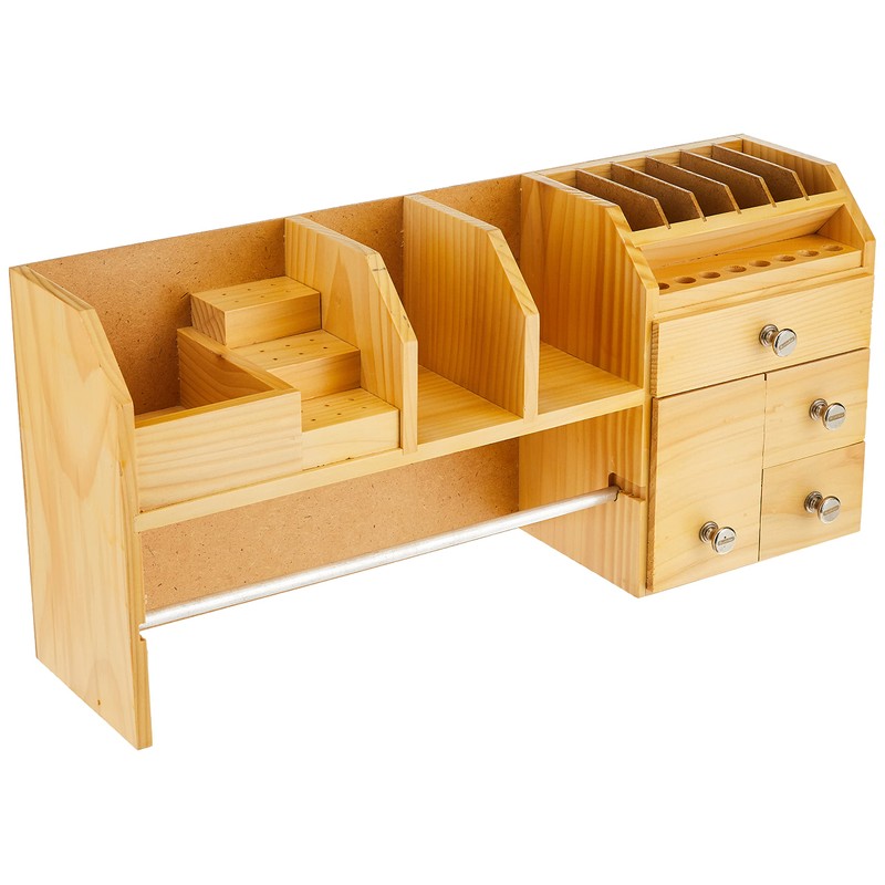 Drawing on the popularity of the Beadalon Wooden Organizer, the Table Top Work Bench has even more compartments to keep supplies organized and easy to access. With slots for tools, drawers for findings, spaces for beads, and holes for tools, this Bench is also a great way for bead stores to keep production supplies organized. A wooden dowel provides a handy way to display and dispense spooled wire. Dimensions: 18 x 4.75 x 9 in. (45.7 x 12.1 x 22.8cm), 9 bins, 4 drawers, 1 rack. Supplies not included.