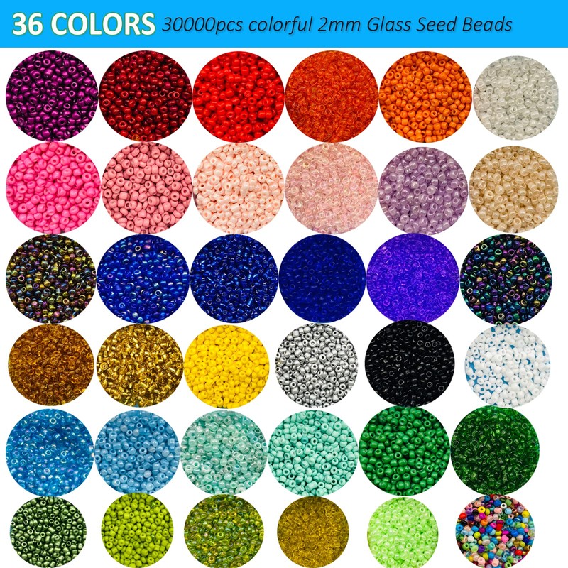 • Various 36 colours, 2 mm glass beads: 30,000 glass beads set contains 36 colours, about 840 beads per colour. You can choose between 4 styles: pure colour, pearl colour, transparent colour, AB colour. The texture of some beads is metallic or cream, and some are transparent series, each colour is completely different and is suitable for your DIY projects of different styles.