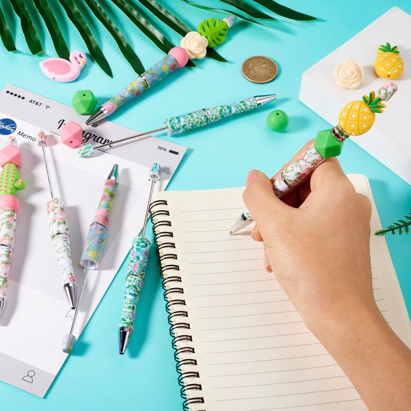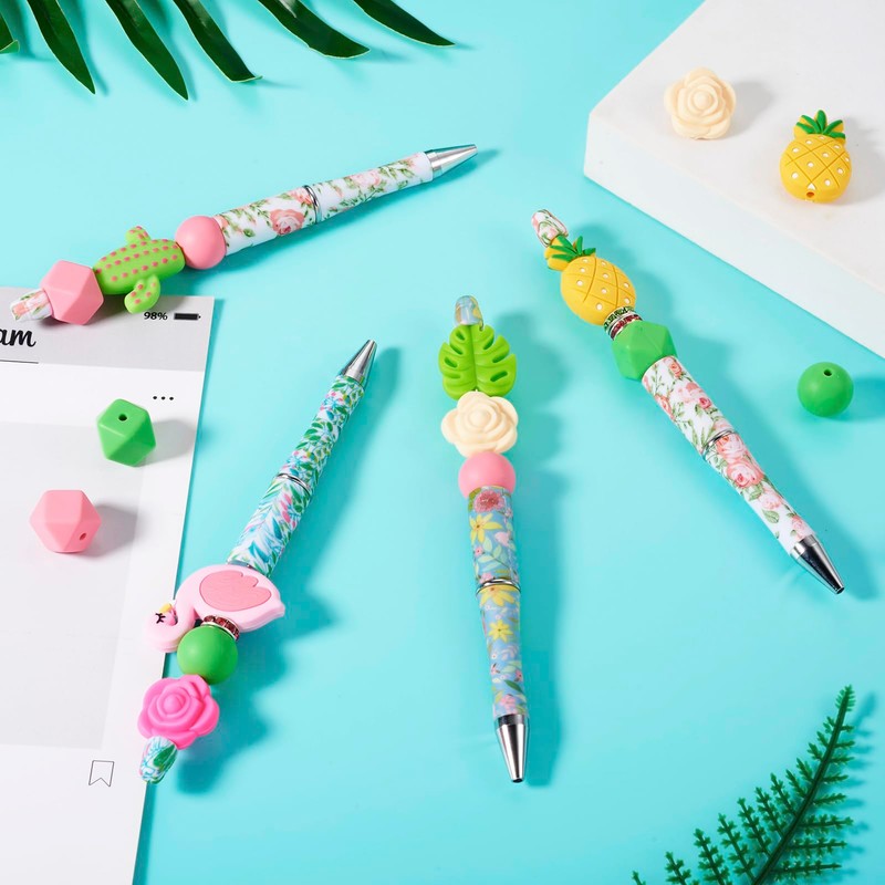 - What You will Receive: 12PCS Flower Prints Shaft Black Ink Beadable Ballpoint Pens (3 colors, 4pcs/color), 24pcs silicone beads (Round & Geometric), 12pcs crystal disc spacers, 12pcs silicone focal beads. Rich styles to meet your various DIY making needs.