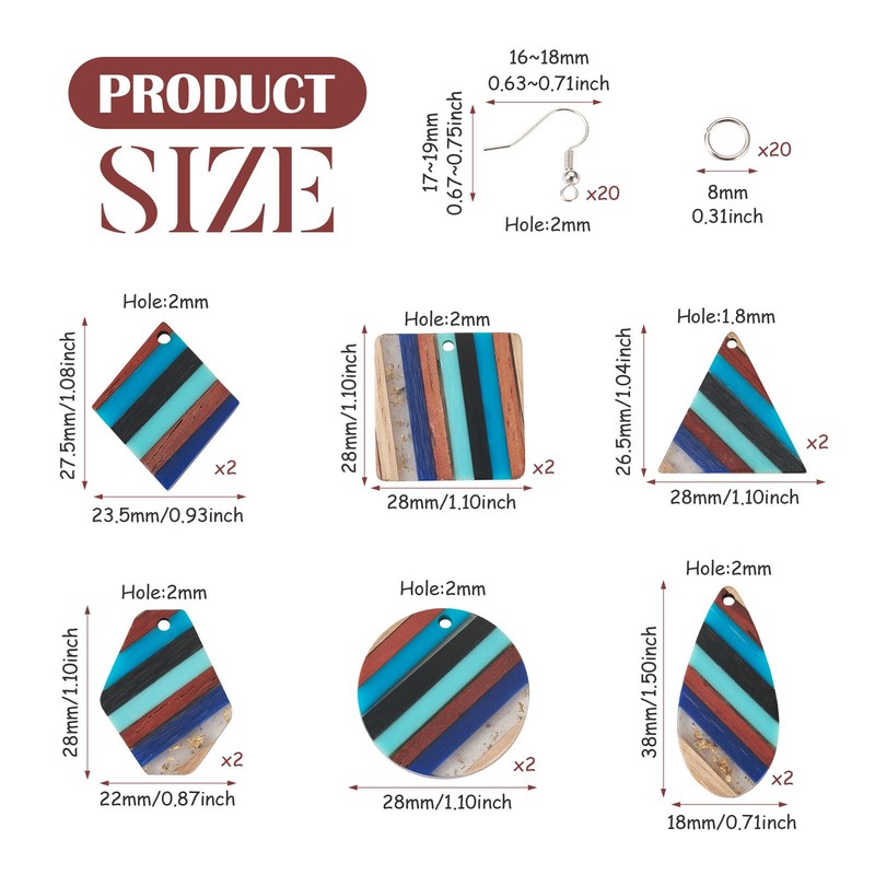 - What You Will Receive: 12pcs Multicolor Boho Resin Wood Earrings Pendants, 6 shapes, 2pcs/shape. Comes with 20pcs earring hooks and 20pcs jump rings, convenient for you to start earrings making crafts.