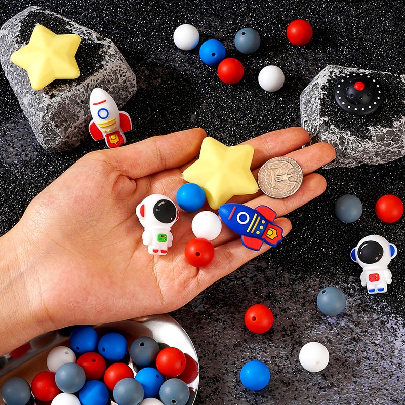 - What You Will Receive: 48pcs Space Theme Silicone Beads, include: 40pcs Round Beads(4 colors, 10pcs/color) + 2pcs Star Beads + 6pcs focal Beads(1pc/style). Size: Round-- about 15mm, hole: 2-2.2mm. Star--39.5x37.5mm, Hole: 3mm. Focal Beads--about 26-35.5mm, hole:2-3mm.