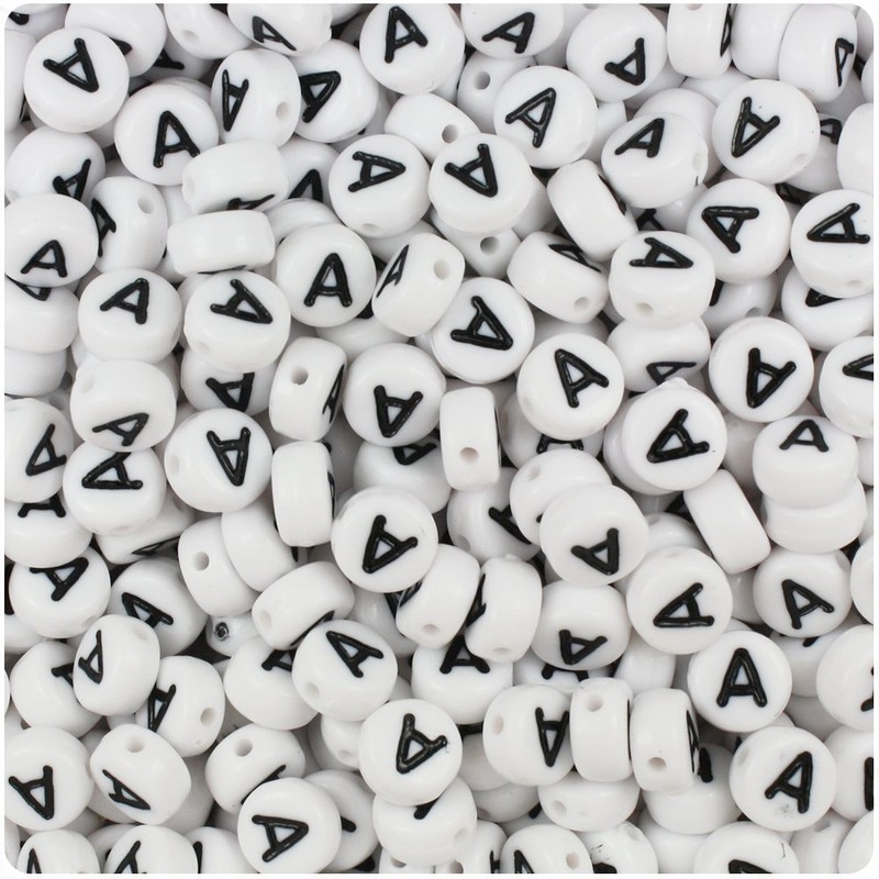 BeadTin White Opaque 7mm Coin Plastic Alphabet Beads - Black Letter A (100pcs)