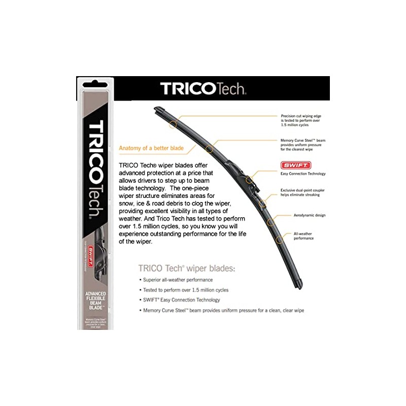 Trico Tech Wipers have a one-piece wiper structure eliminates areas for snow, ice and road debris to clog the wiper, providing excellent visibility in all types of weather