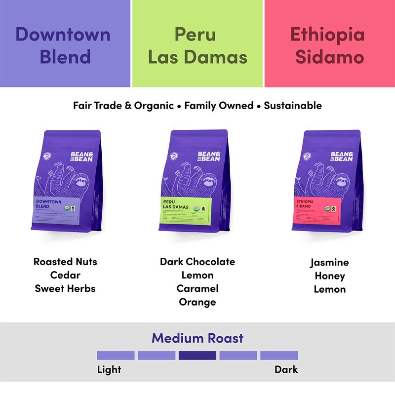 Bean & Bean NYC Top 3 Bundle – Organic Coffee Variety Pack – Freshly Roasted Downtown Blend, Peru Las Damas, Ethiopia Sidamo Coffee Beans – Fair Trade Medium Roast Whole Bean Coffee Gift Set, 3 x 11oz