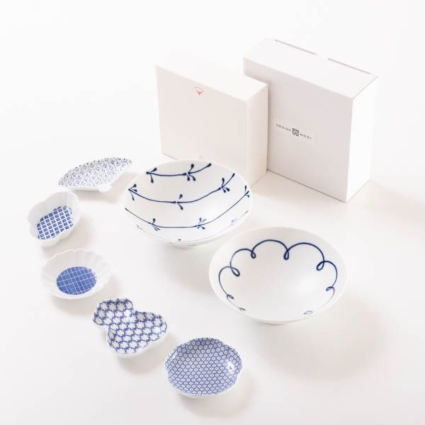 Product description Northern European-style set of bean plates and flat bowls with beautiful indigo reflecting white porcelain.