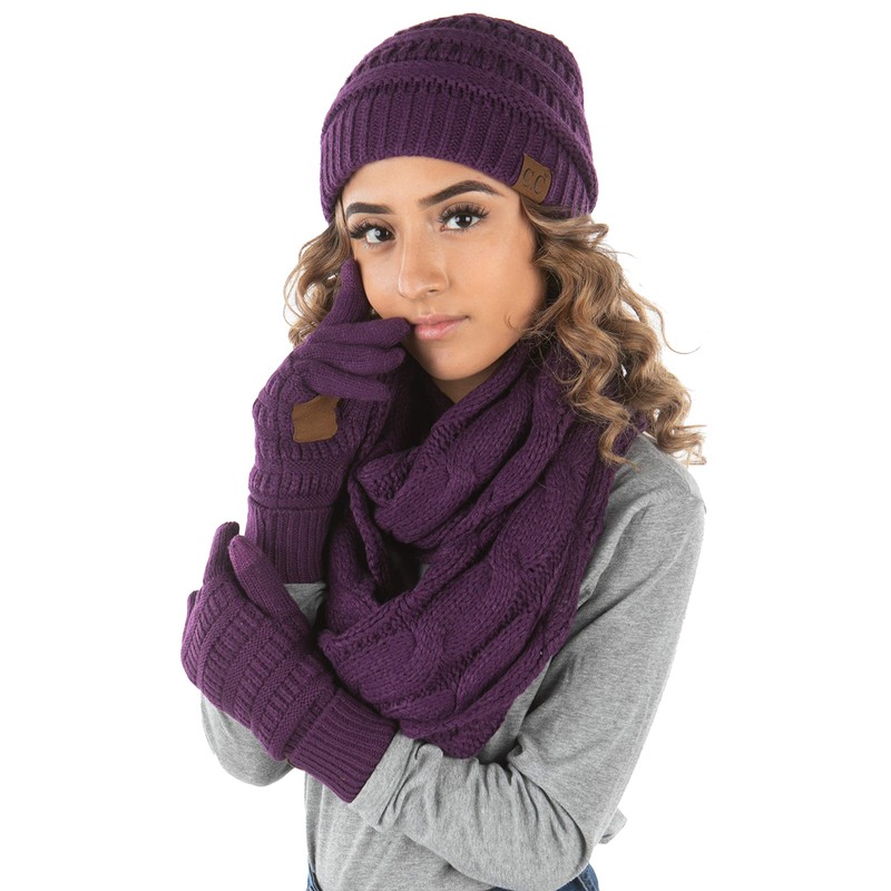 - GREAT LOOK: Stay warm and trendy with these cable knit beanie, fleece lined glove, and infinity scarf bundles, especially in the cold winter weather. Amp up any casual outfit, even add a touch of color to your favorite coat(s) with some of our more bright and colorful sets. Looks great with sweaters, cardigans, coats, jackets, tees, tanks, layers and more.