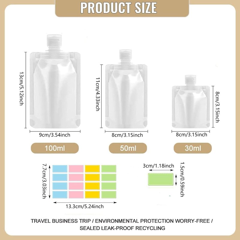 - 【Package Contents】You will receive 15 travel pouches for toiletries, in 3 different sizes, 5 each of 30ml, 50ml and 100ml, comes with 2 set stickers, each set has 16 units. This product is very suitable for travel, vacation, air travel, and camping, and can meet your short-term travel needs.