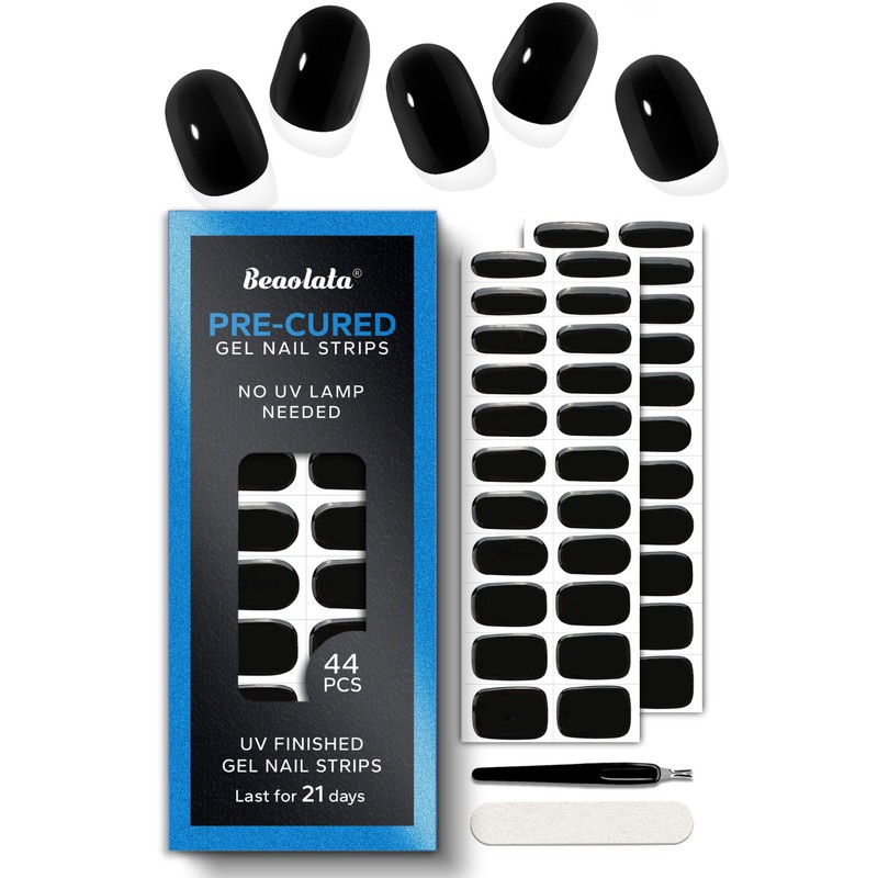 Beaolata Pre Cured Gel Nail Strips - 44PCS Salon Quality Gel Nail Stickers - Long Lasting Polish Wraps for Women no UV Light Needed Easy Apply& Remove (Obsidian Black)