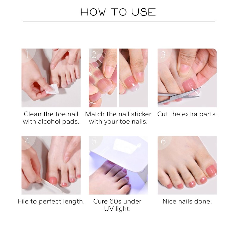- Easy to Use: The gel toenail wrap stickers are easy to put on, file down, and cure by UV light. You can get salon-quality nail art in just a few minutes. Removal is also quite easy, peel them off with a wooden stick or fingers.