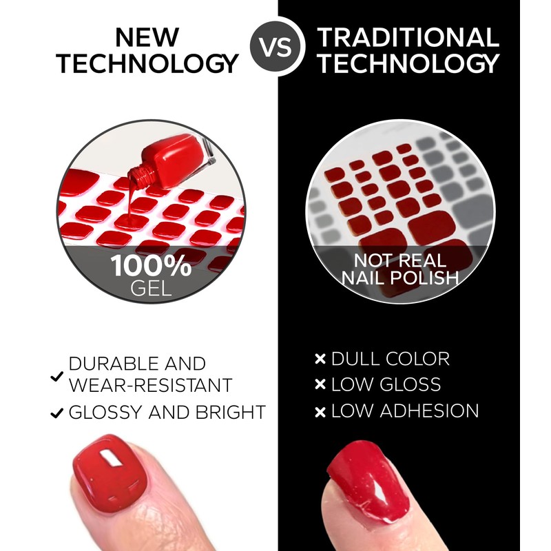 - Real gel toe nail strips: These stickers contain real gel polish ingredients (base, color, and top coat layers) in a single application. Unlike plastic-based stickers, the flexible gel adapts to nail contours without requiring additional topcoat.