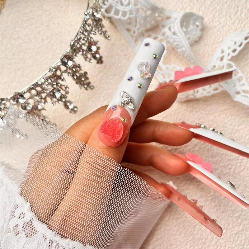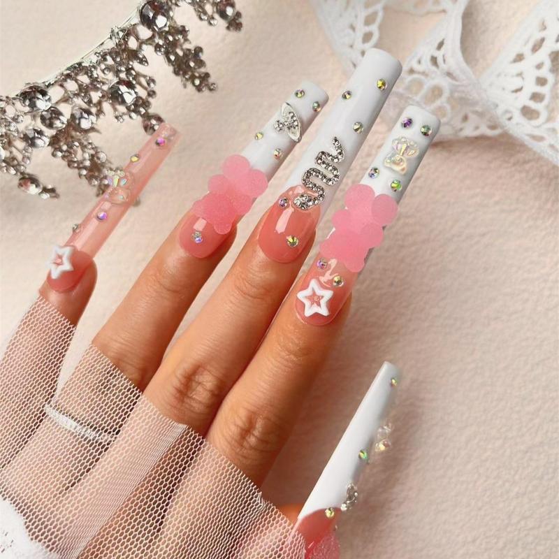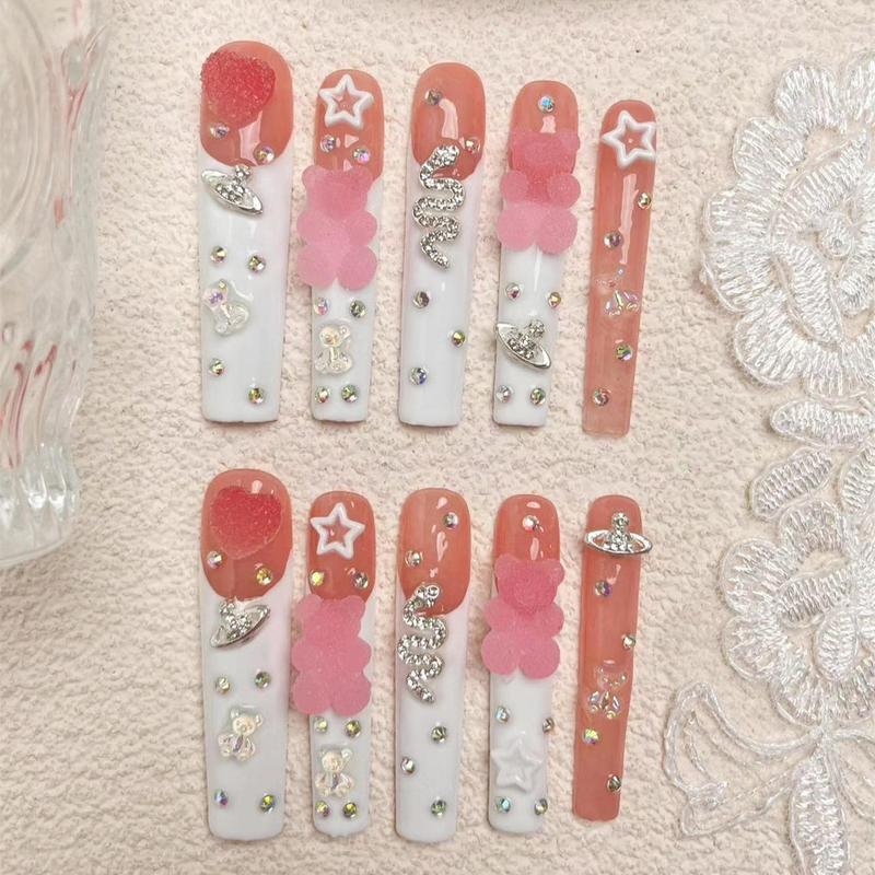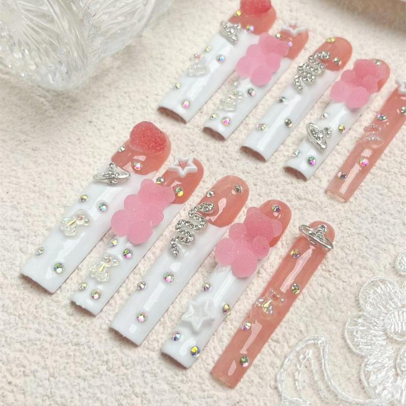 Bear Decor Handmade Press on Nails with Nail File & Jelly Glue, 10pcs Extra Long Square Fake Nail Tips, DIY Elegant Stick on Nails Kit - pattern: Bear, Specification: L