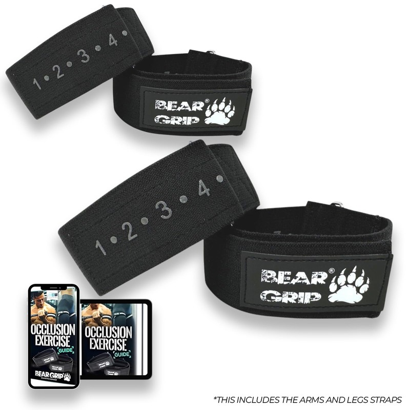 - BUNDLES (BOTH ARMS AND LEGS) - PREMIUM HIGH QUALITY PRODUCT 🏋– BEAR GRIP Blood Flow Restiction Workout Bands has upgraded to an Improved 2.0 version with strong links and no skin pinching design. Blood Flow Restiction Workout Bands is one of the most effective way to build muscle, Strength and tone your body during exercising and rehab. It also provides the amount of pressure needed to adequately restrict proper blood flow, but not movement or muscle contractions.