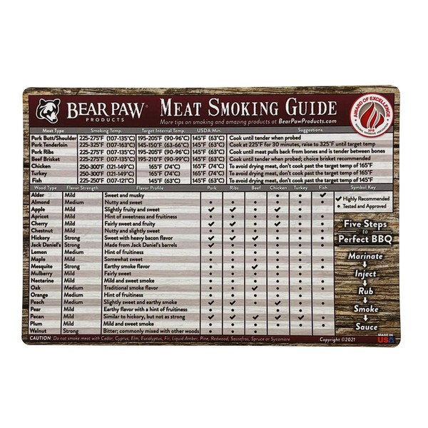 Take your meat smoker experience up a notch with the BEST ALL-IN-ONE MAGNETIC MEAT SMOKING GUIDE AROUND. DURABLE AND PERFECTLY SIZED, the Bear Paws Meat smoking magnet fuses convenience with professional experience to bring you the best in smoking meat accessories. Our magnet provides A COMPREHENSIVE REFERENCE OF THE MOST IMPORTANT INFORMATION FOR SMOKING MEAT. This clear, easy-to-read chart gives you the WOOD SMOKE FLAVOR INDEX of the 20 most popular woods for smoking. An easy checklist suggests ideal WOOD PELLET AND MEAT PAIRINGS for unbelievable flavor. Get the most out of your meat smoker with the SMOKING TEMPERATURE CHART provided at the top of the magnet, indicating the correct setting for your smoker in both Fahrenheit and Celsius. We provide both the USDA MINIMUM TEMPERATURE FOR SAFE MEAT PREPARATION AND OUR TARGET INTERNAL MEAT TEMPERATURE GUIDE so that you’ll know exactly when you’ve achieved tender, flavorful meat. Finally, we’ve compiled the BEST PRO TIPS FROM AWARD-WINNING PITMASTERS to make your BBQs the stuff of legends. Our information-packed reference magnet is a 5.5” x 8”, perfect for keeping handy during meat preparation. Its HEAVY-DUTY CONSTRUCTION AND LAMINATION MEAN THAT IT IS WEATHER-RESISTANT and will last for years to come. A favorite of BBQ pros, the Meat Reference Guide Magnet is the PERFECT BBQ ACCESSORY to gift to the meat lover in your life.