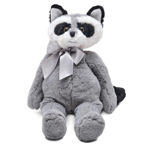 - CAMPER THE RACCOON: Adorably cute 16” tall plush stuffed animal gray raccoon with soft fur, shimmering crystal style eyes and satin bow, surface washable