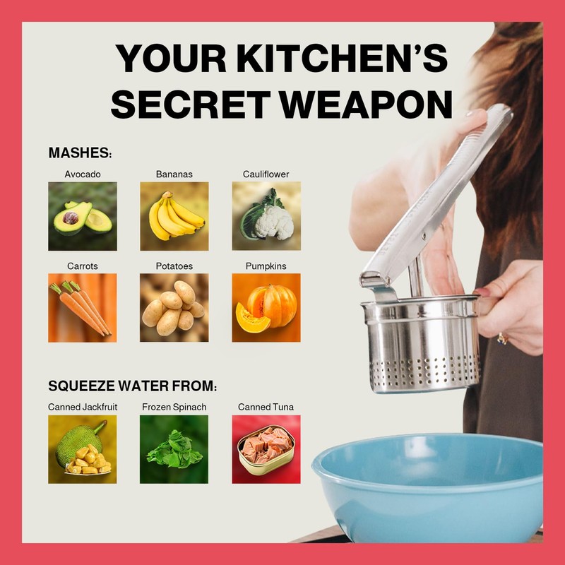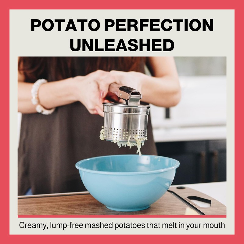 • YOUR KITCHEN'S SECRET WEAPON - Unleash your culinary creativity! This potato ricer is not confined to potatoes alone. It transforms carrots, cauliflower, pumpkin, and more into gourmet masterpieces. Squeeze out frozen spinach's excess water or catapult your tuna sandwiches to the next level. Don't just cook; create culinary magic! ADD TO CART now and embark on a culinary journey.